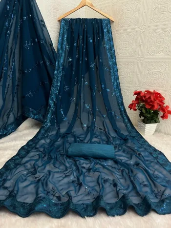 SIZE : 80 METER (UN-STITCHED)SKU: 82505-5 - MODERN GEORGETTE SILK SEQUENCE WORK ALL OVER WITH PIPING BORDER WORK SAREE WITH UNSTITCHED BLOUSE TEAL ₹789.00