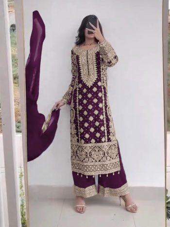 LENGTH: 52″ + INCHSKU: 62900 - DESIGNER GEORGETTE EMBROIDERY SEQUENCE WORK WITH MOTI WORK TOP PALAZZO WITH DUPATTA CHIKU ₹1,249.00