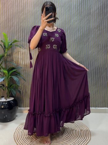 NECK TYPE :- PAN SHAPEDSKU: 75008-1 - LATEST GEORGETTE HAND WORK ONE PEICE DRESS WINE ₹1,055.00