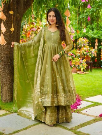 - DESIGNER GMY SILK SEQUENCE EMBROIDERY WORK TOP PALAZZO WITH DUPATTA CHIKU ₹1,215.00