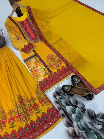 SAREE WITH UNSTITCHED BLOUSESKU: 76049-5 - MODERN SILK DIGITAL PRINT WITH REAL MIRROR HAND WORK TOP PALAZZO WITH DUPATTA YELLOW ₹1,319.00