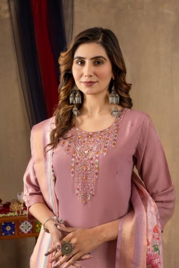 (HOOK BACK SIDE OPEN)SKU: 77845-6 - FASHIONABLE SHIMMER GOLD SILK MULTI EMBROIDERY THREAD, WITH HAND WORK TOP BOTTOM WITH DUPATTA PINK ₹1,389.00