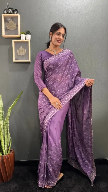 PACKAGE CONTAIN :- LEHENGA, BLOUSE, DUPATTA, DRAWSTRING WITH ZIP, TASSELSSKU: 74818-2 - TRENDING GEORGETTE SILK EMBROIDERY MULTI SEQUENCE &CUT WORK READY TO WEAR SAREE WITH UNSTITCHED BLOUSE PURPLE ₹2,083.00