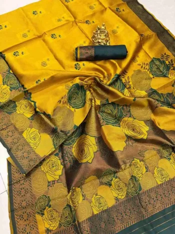 SAREE WITH UNSTITCHED BLOUSESKU: 81520-3 - DESIGNER BANARASI SILK FLOWERS AND MINA & ZARI WEAVING RICH PALLU WITH BORDER WORK SAREE WITH UNSTITCHED BLOUSE YELLOW ₹642.00