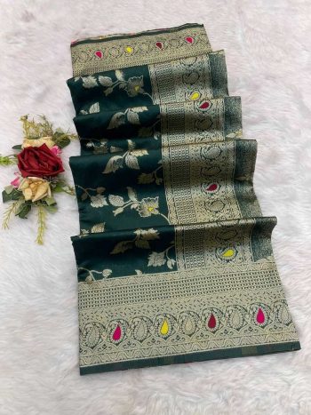 - NEW ARRIVAL BANARASI SILK FLOWERS AND MINA WITH ZARI WEAVING BORDER WORK SAREE WITH UNSTITCHED BLOUSE DARK GREEN ₹624.00