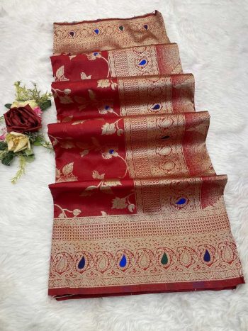 SAREE WITH UNSTITCHED BLOUSESKU: 80370-8 - NEW ARRIVAL BANARASI SILK FLOWERS AND MINA WITH ZARI WEAVING BORDER WORK SAREE WITH UNSTITCHED BLOUSE RED ₹624.00