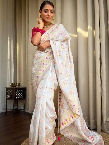 SAREE WITH UNSTITCHED BLOUSESKU: 80280-2 - NEW ARRIVAL BANARASI SOFT SILK GOLD ZARI WEAVING WORK SAREE WITH UNSTITCHED BLOUSE WHITE ₹556.00