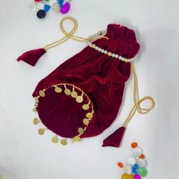 CLOSER : PEARL HANDLE WITH DORI CLOSERSKU: 81297-3 - DESIGNER VELVET ROUND SHAPED PLAIN WITH SIKKA ZUMKA LACE ON BOTTOM ROUND POTLI PURSE MAROON ₹207.00