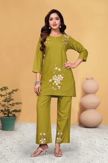 IN PACKAGE : (TOP BOTTOM FULLY STITCHED SET)SKU: 81224-4 - LATEST HEAVY RAYON PRINT WORK CO-ORD SET PISTA ₹625.00