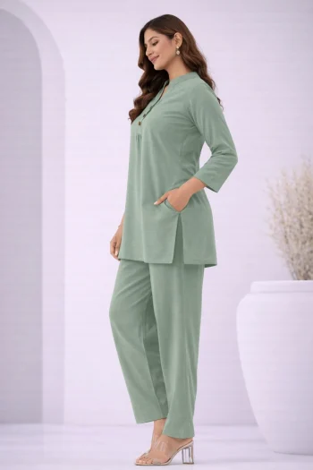 LENGTH : 37+ INCHSKU: 82645 - NEW ARRIVAL COTTON BLEND PLAIN CO-ORD SET PISTA ₹427.00