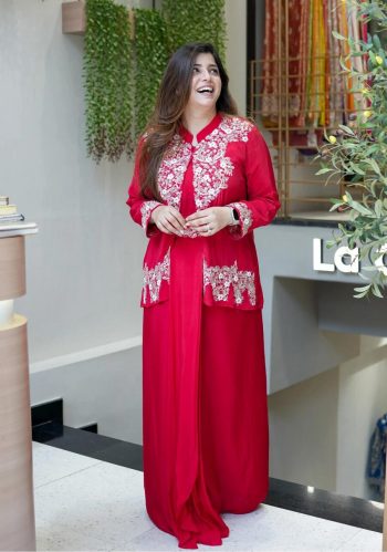 JACKET : FULL – STITCHEDSKU: 69055-1 - FASHIONABLE CHINNON SILK EMBROIDERY AND SEQUENCE WORK DRAPE SKIRT BLOUSE WITH KOTI RANI ₹1,388.00