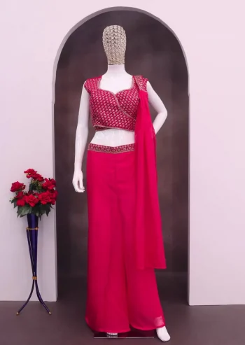 WORK : CODING SEQUENCE EMBROIDERY WORKSKU: 81023-3 - LATEST GEORGETTE FOIL MIRROR AND THREAD WORK PALAZZO AND UN-STITCHED BLOUSE WITH SHRUG PINK ₹2,224.00