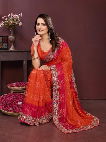 SAREE WITH UNSTITCHED BLOUSESKU: 80612-2 - DESIGNER GEORGETTE DIGITAL PRINT WITH CONTRAST PALLU EMBROIDERY WORK SAREE WITH UNSTITCHED BLOUSE ORANGE ₹1,319.00