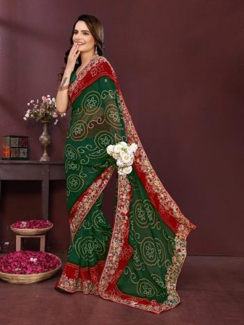 SAREE + UNSTITCHED BLOUSESKU: 77975-4 - MODERN GEORGETTE LAHERIYA BANDHEJ PRINT WITH LACE BORDER WORK SAREE WITH UNSTITCHED BLOUSE GREEN ₹1,071.00