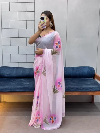 TYPE: UNSTITCHED ATTACHED WITH SAREESKU: 72123 - MODERN GEORGETTE HANDPAINT FLOWER PRINT PANEL WORK WITH CUT DANA HANDWORK SAREE WITH UNSTITCHED BLOUSE BABY PINK ₹1,041.00