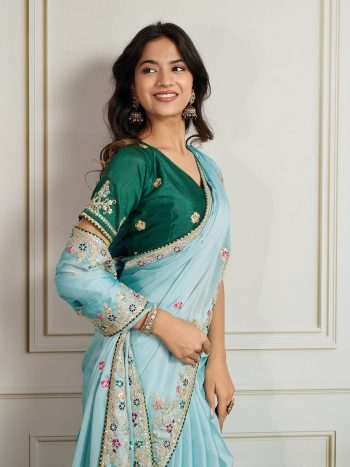 SAREE + UNSTITCHED BLOUSESKU: 81320-2 - DESIGNER HEAVY FAUX GEORGETTE EMBRIDORRY WORK SAREE WITH UNSTITCHED BLOUSE GREEN ₹834.00