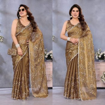SAREE WITH STITCH BLOUSESKU: 73849-7 - 5FANCY JIMMY CHOO EMBROIDERY WORK SAREE WITH UNSTITCHED BLOUSE CHIKU ₹1,041.00