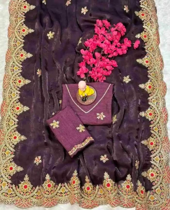 SAREE WITH UNSTITCHED BLOUSESKU: 79020 - DESIGNER FENDY SATIN EMBROIDERY WORK AND MULTI THREAD WORK WITH ARC CUT WORK BORDER WORK SAREE WITH UNSTITCHED BLOUSE WINE ₹1,714.00