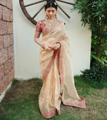 SAREE FABRIC :- SOFT ORGANZAWORK :-Â ALL OVER EMBROIDERY CUT WORK BORDER WITH HEVAY EMBROIDERY SEQUENCE WORKBLOUSE :- MONO BANGLORYSAREEÂ CUT :- 5.5 METERBLOUSEÂ CUT :- 1.20 METERSAREE WITH UNSTITCHED BLOUSE