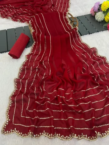 SAREE + UNSTITCHED BLOUSESKU: 82176-3 - DESIGNER SATIN CHIFFON EMBROIDERY 3 MM SEQUENCE WORK HEAVY BORDER WORK SAREE WITH UNSTITCHED BLOUSE RED ₹877.00