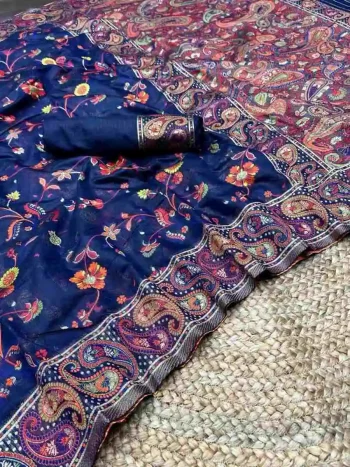 SAREE WITH UNSTITCHED BLOUSESKU: 82444-7 - MODERN KASHMIRI PASMINA THREAD WEAVING PURE ZARI WEAVING WORK SAREE WITH UNSTITCHED BLOUSE NAVY BLUE ₹1,428.00
