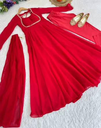- DESIGNER GEORGETTE EMBROIDERY SEQUENCES LACE AND FANCY CRIZZ WITH HAND WORK GOWN BOTTOM WITH DUPATTA RED ₹1,319.00
