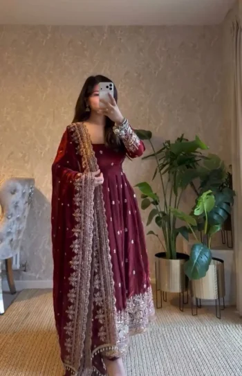 LENGTH : 2.2 METERSKU: 80740-4 - NEW ARRIVAL GEORGETTE SEQUENCE EMBROIDERY WORK GOWN BOTTOM WITH DUPATTA MAROON ₹1,571.00
