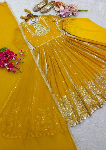 LENGTH : 2.2 METERSKU: 82184-1 - FANCY GEORGETTE MULTI THREAD EMBROIDERY SEQUENCE WORK GOWN BOTTOM WITH DUPATTA YELLOW ₹1,459.00