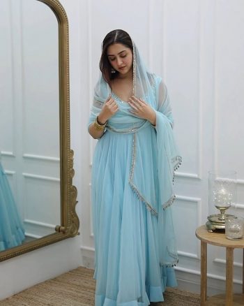 PACKAGE CONTAIN :- GOWN-1, DUPATTA-1, BOTTOM-1SKU: 75641-4 - FANCY GEORGETTE HAND EMBROIDERY, REAL MIRROR KASAB JARI WORK GOWN BOTTOM WITH DUPATTA SKY ₹1,319.00
