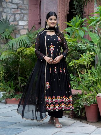 LENGTH : 39 INCHSKU: 82748 - RICH LOOK GEORGETTE EMBROIDERY SEQUENCE WORK GOWN BOTTOM WITH DUPATTA BLACK ₹1,787.00