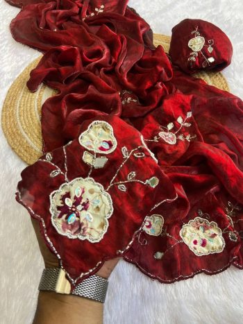 SAREE WITH UNSTITCHED BLOUSESKU: 81690-5 - NEW ARRIVAL PURE VETLESS HOT FIX WORK SAREE WITH UNSTITCHED BLOUSE MAROON ₹971.00
