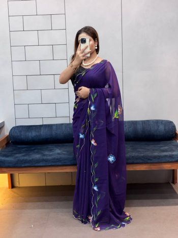 (SAREE WITH UNSTITCHED BLOUSE)SKU: 74688-7 - FANCY GEORGETTE HANDPAINT FLOWER PRINT PANEL WORK WITH CUT DANA HANDWORK SAREE WITH UNSTITCHED BLOUSE PURPLE ₹1,041.00