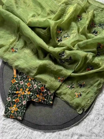 SAREE WITH UNSTITCHED BLOUSESKU: 82968-2 - DESIGNER ORGNAZA HAND JARKHAN AND DIAMOND WORK SAREE WITH UNSTITCHED BLOUSE MEHNDI ₹1,857.00