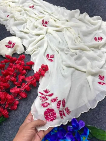 SAREE WITH UNSTITCHED BLOUSESKU: 79119-6 - DESIGNER STAR GEORGETTE MULTI COLOR PATCH WORK AND HANDWORK BORDER WORK SAREE WITH UNSTITCHED BLOUSE WHITE AND PINK ₹1,388.00