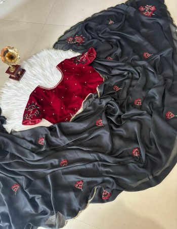 SAREE + UNSTITCHED BLOUSESKU: EG37722 - MODERN GEORGETTE HANDWORK KHATALI CUT DANA WITH MOTI & SMALL FLOWER BORDER WORK SAREE WITH STITCHED BLOUSE NAVY BLUE ₹1,214.00