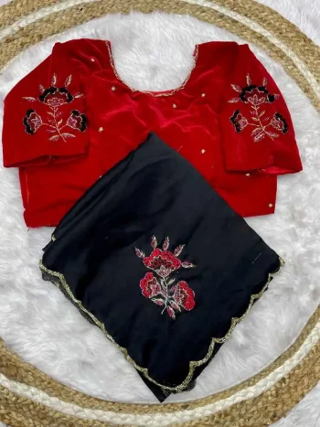 SAREE WITH UNSTITCHED BLOUSESKU: 73452-7 - DESIGNER FENDY SATIN SILK HAND WORK WITH CUT WORK AARCO BORDER WORK SAREE WITH STITCHED BLOUSE RED ₹1,929.00