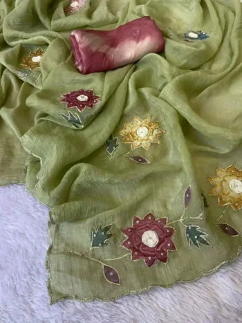 SAREE WITH UNSTITCHED BLOUSESKU: 81627 - DESIGNER CRUNCHY HANDWORK AND PATCHWORK BORDER WITH FLOWAR WORK SAREE WITH UNSTITCHED BLOUSE PISTA ₹1,358.00