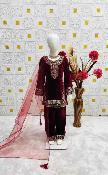 SIZE :- 3 YRS | 4 YRS | 5 YRS | 6 YRS | 7 YRS | 8 YRS | 9 YRS | 10 YRS | 11 YRS | 12 YRS | 13 YRS | 14 YRS | 15 YRS | (REFER TO SIZE CHART)SKU: 71551-5 - NEW ARRIVAL VELVET EMBROIDERY SEQUENCE WORK TOP BOTTOM WITH DUPATTA MAROON ₹1,357.00