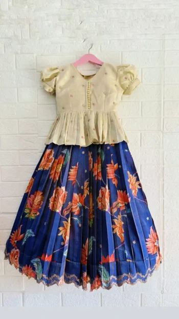 ALTERNATIVELY, YOU MAY MENTION THE DESIRED SIZES IN THE “ORDER NOTES” SECTION DURING CHECKOUTSKU: 80199-4 - MODERN COTTON SILK EMBROIDERY SEQUENCE WORK KID’S TOP LEHENGA OFF WHITE AND BLUE ₹1,214.00