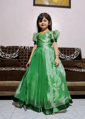 KIDS READY TO WEAR SAREESKU: 76713-17 - MODERN JC SILK SATIN LACE BORDER WORK KID’S GOWN GREEN ₹786.00