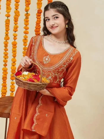 ALTERNATIVELY, YOU MAY MENTION THE DESIRED SIZES IN THE “ORDER NOTES” SECTION DURING CHECKOUTSKU: 78704-11 - DESIGNER SILK WEAVING WITH EMBROIDERY CUTWORK BORDER WORK KID’S TOP WITH LEHENGA RED ₹1,181.00