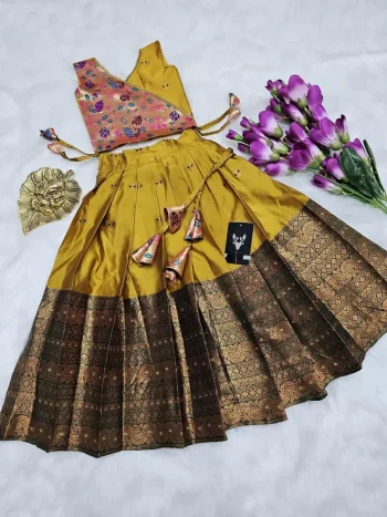 ALTERNATIVELY, YOU MAY MENTION THE DESIRED SIZES IN THE “ORDER NOTES” SECTION DURING CHECKOUTSKU: 81809 - DESIGNER KANJIVARAM SILK ZARI WEAVING WORK KID’S LEHENGA CHOLI MUSTARD ₹1,142.00