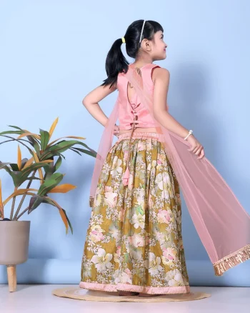 KIDS READY TO WEAR SAREESKU: 76713-2 - FANCY BANGLORI DIGITAL FLOWER PRINT WITH LACE BORDER WORK KID’S LEHENGA CHOLI WITH DUPATTA MEHNDI ₹929.00