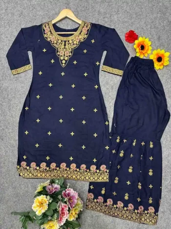 NOTES: THREE QUARTER SLEEVES COME 16-17 INCH LONGSKU: 52868 - NEW ARRIVAL VELVET SEQUENCE & ZARI EMBROIDERY WORK TOP PALAZZO SET NAVY BLUE ₹1,285.00