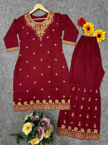 PALAZZO SIZE:- FREE SIZE UP TO XXL ELASTIC WITH BELTSKU: 74606-2 - DESIGNER COTTON SILK EMBROIDERY CHIKANKARI WORK KURTI PALAZZO SET MAROON ₹715.00