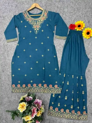 HEIGHT : 40” INCHSKU: 80998-3 - FANCY CHINON EMBROIDERY SEQUENCE WORK TOP PALAZZO SET BLUE ₹1,388.00