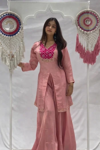 LENGTH : 37-38 INCHSKU: 78775-5 - FANCY CHINON MULTI EMBROIDERY WORK TOP PALAZZO SET BABY PINK ₹999.00