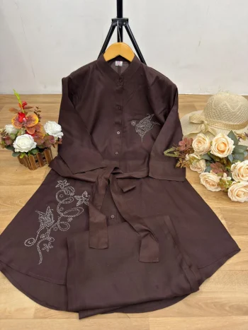 NOTES: THREE QUARTER SLEEVES COME 16-17 INCH LONGSKU: 50731 - RICH LOOK RAYON DIAMOND WORK WITH FANCY BELT AND KURTI PALAZZO SET BROWN ₹642.00