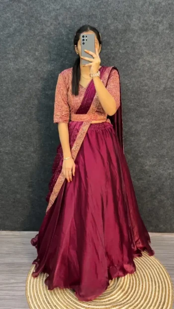 PACKAGE CONTAIN :- LEHENGA, BLOUSE, DUPATTA, DRAWSTRING WITH ZIP, TASSELSSKU: 74818-4 - DESIGNER MALAI SATIN PLAIN LEHENGA WITH SEQUENCE , DORI & ZARI WORK BLOUSE AND DUPATTA GREEN ₹1,857.00