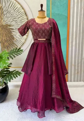 SIZE :- FREE SIZE ( FULLY STITCHED )SKU: 77100-2 - MODERN CHINON EMBROIDERY THREAD WORK LEHENGA CHOLI WITH DUPATTA WINE ₹1,714.00